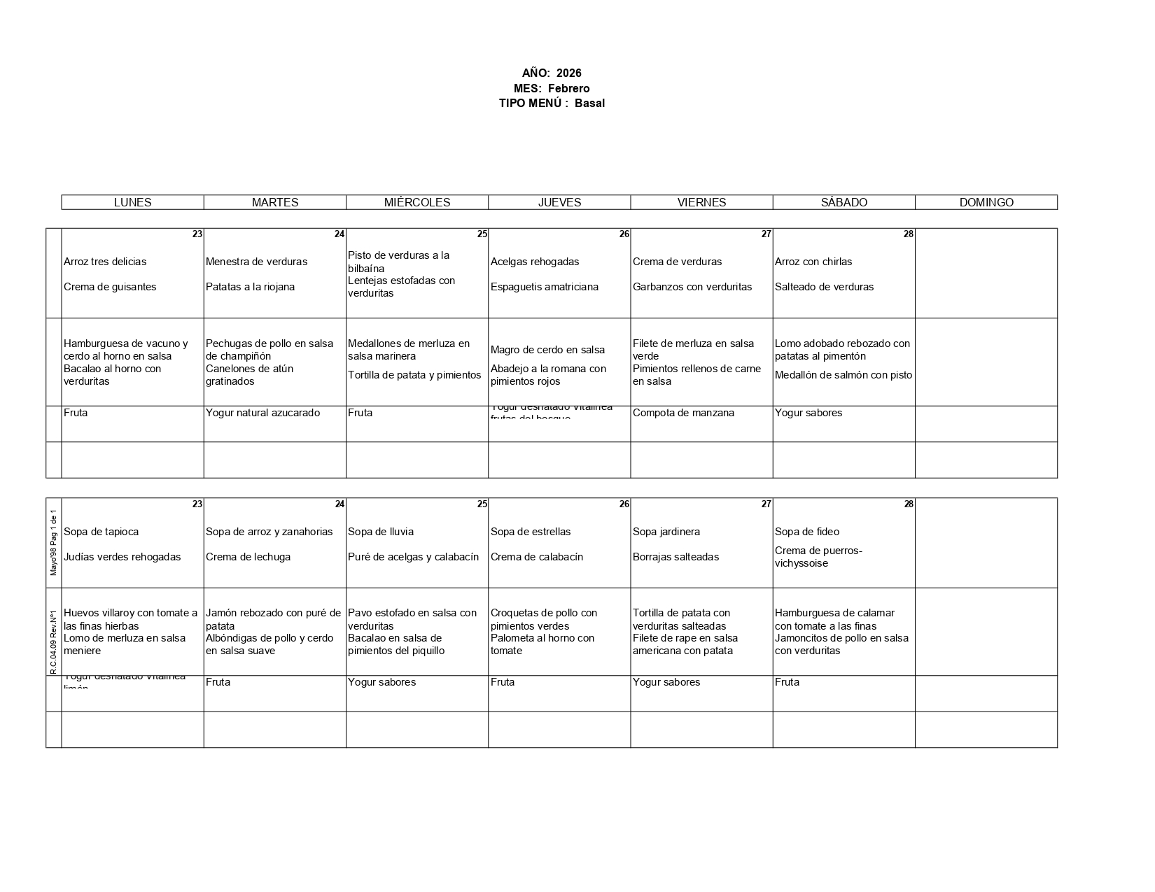 Lunes 23 Febrero Segundos Comida